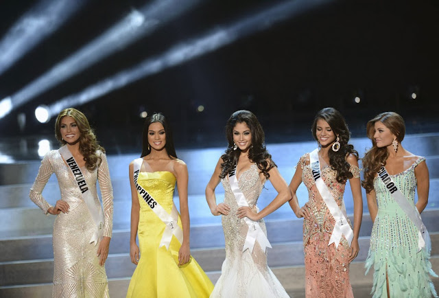 Back to the top five assessment. Miss Brazil Jakelyne Oliveira made the cut because she had the best swimsuit body (she's your typical tanned, sexy Brazilian beach garota) but I found her face a little odd (maybe it's her pug nose). Miss Ecuador Constanza Baez was off my radar until she wowed me in the swimsuit competition, but she's a regular butterface and her mint-colored frilly gown didn't do justice to her fabulous figure. She would also fix her hair once in a while, which annoyed me. Miss Philippines Ariella Arida - who won the 16th semifinal stop via online voting - had the most beautiful hair, so silky and bouncy, but her bright sunny yellow strapless gown was more appropriate for a high school prom (although the color perfectly suited her dusky complexion). Her facial expressions were also bland. Miss Venezuela Gabriela Isler gave a strong and consistent performance throughout the entire competition; she was not in my top five list (Spain, Ukraine, Great Britain, USA, Dominican Republic), but she's Miss Venezuela, and that's good enough for the judges to crown her in her iridescent silver gown. Like all past Venezuelan representatives, Gabriela emitted an effervescent personality and remarkable stage projection. Though compared to her predecessor, Gabriela's beauty is ordinary. It's easy to get tired of looking at her.